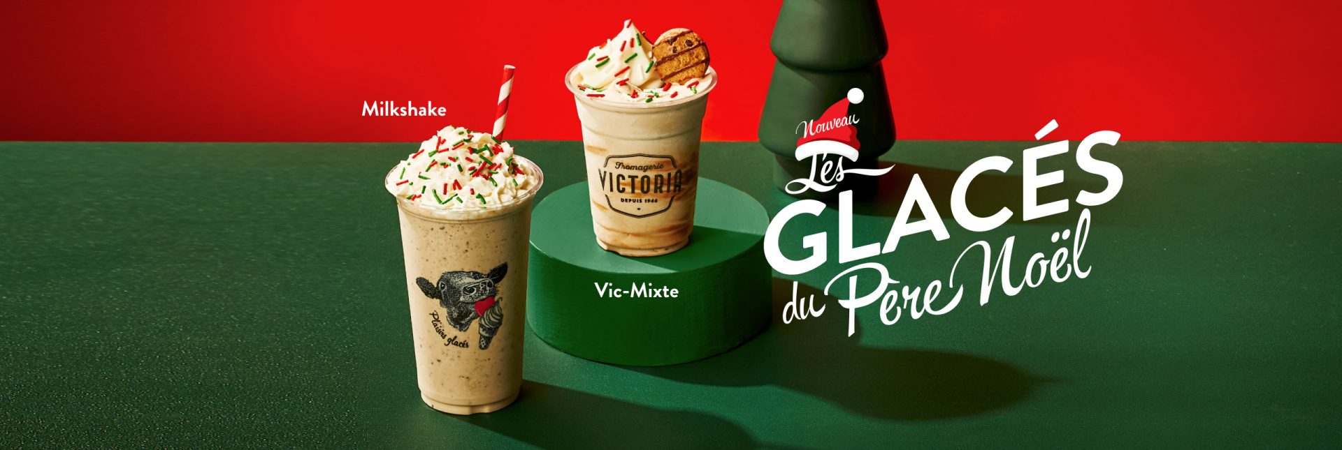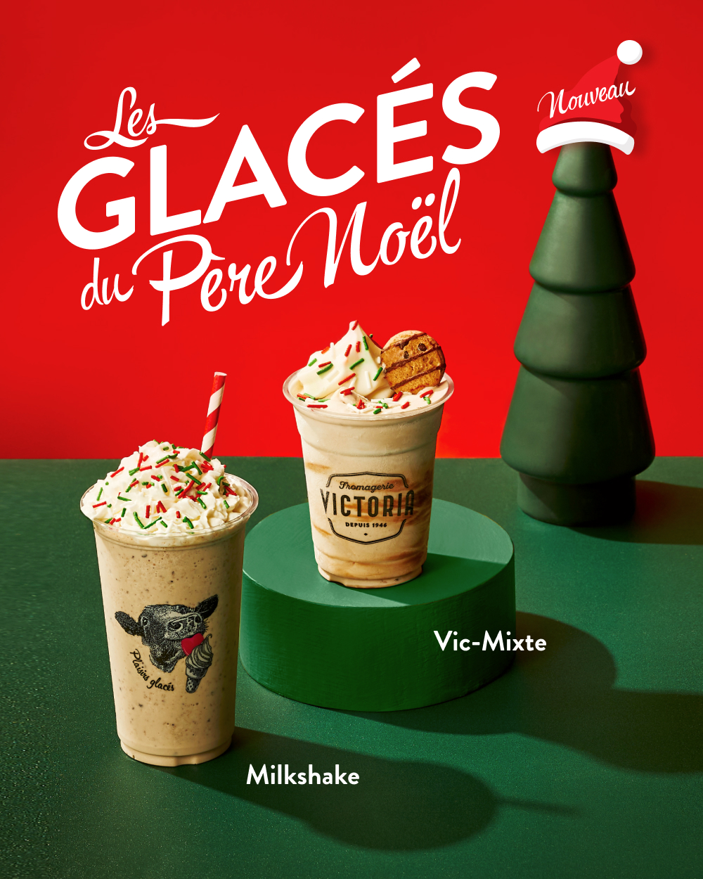 À l’approche du temps des fêtes, le Père Noël nous a demandé d’ajouter notre touche festive à sa recette, nous avons créé les Glacés du Père Noël. Disponibles en version Vic-Mixte et Milkshake, nous avons combiné crème glacée, biscuits aux pépites de chocolat, sauce au chocolat chaud, et vermicelle de Noël. De quoi passer un temps des fêtes gourmands.